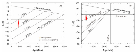 Zircon Lu-Hf Isotope diagrams of the Tailu pluton in the Qinling–Qilian conjunction zone. (a) εHf(t) vs. Age (Ma) diagrams; (b) εHf(t) vs. Age (Ma) diagram (Ma). Huoyanshan granite [32].
