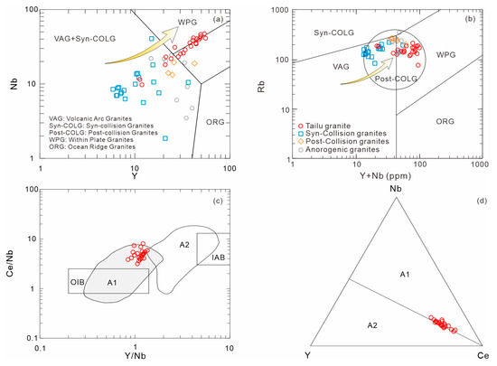 The tectonic setting diagrams of the Tailu pluton in the Qinling–Qilian conjunction zone: (a) Nb vs. Y [98]; (b) Rb vs. (Y + Nb) [98]; (c) Ce/Nb vs. Y/Nb [74]; (d) Nb vs. Y versus Ce [74]. Syn-collision granites [28,31,33,44]. Post-collision granite [28]; Anorogenic granites [28,31]. All the granites were from the Qinling–Qilian conjunction zone.