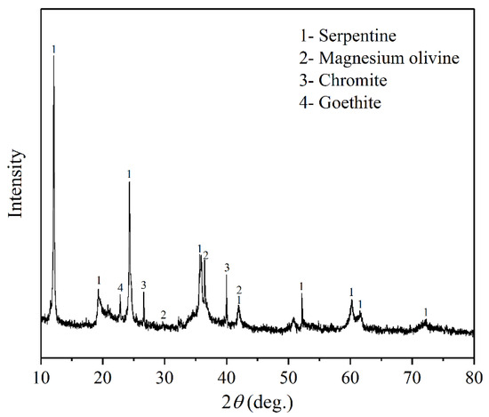 The low-grade laterite nickel ore used in this study was obtained from Zimbabwe, and the major metal elements of the sample are listed in Table 1. From Table 1, we can see that the content of Ni and Fe in the low-grade laterite nickel ore are 0.98% and 6.99%, respectively, which clearly suggests that the nickel content of the sample is low, and the iron content is significantly lower than previous literature reported [3,19,20,21]. Therefore, it is needed to investigate how to recover Ni from the low-grade laterite nickel ore with low Fe content. The mineral composition was determined via XRD; the XRD pattern is shown in Figure 1, and the main mineral compositions are shown in Table 2. As can be seen from Table 2, the major mineral phases are serpentinite ((Mg,Fe,Ni)3Si2O5(OH)4), magnesium olivine (Mg2(SiO4)) and chromite ((Fe,Mg)Cr2O4), the contents of which are 64.4%, 19.3%, and 6.4%, respectively. And the goethite (FeOOH), hornblende ((Ca,Na)2(Mg,Fe,Al)5[(Al,Si)8O22](OH)2) and quartz (SiO2) are minor mineral phases with contents of 3.4%, 3.4%, and 1.4%, respectively. The embedding particle size of the main minerals were analyzed with MLA analysis, as shown in Table 3. From Table 3, we can see that the particle size of serpentinite and magnesium olivine in the sample are mainly distributed below 150 μm and uniformly distributed in different particle size ranges. The particle size of chromite in the sample is mainly distributed in the particle size of 38 μm and 150 μm. The reductant used in this study was coking coal, with the calorific value of 7193 kcal/kg, and the chemical analysis of the coal is given in Table 4. The calcium fluoride (CaF2) and iron oxide (Fe2O3) were obtained from Sinopharm Chemical Reagent Co., Ltd., Shanghai, China. The CaF2 was an analytical reagent, and the content of CaF2 was higher than 98.5%. The Fe2O3 was an analytical reagent, and the content of Fe was between 69.8% and 70.1%.