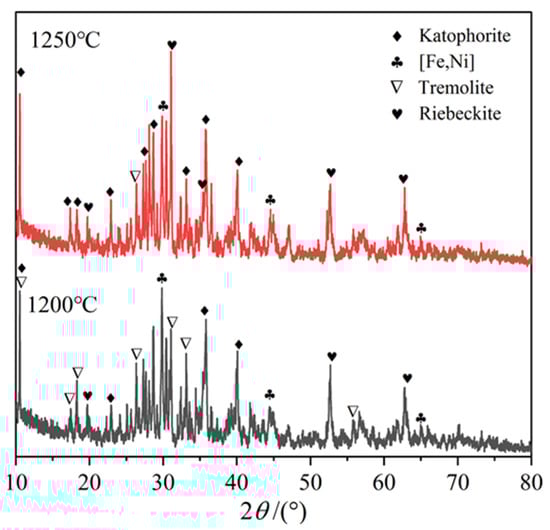 Many studies have proven that the reduction temperature has a significant impact on the nickel–iron concentrate for laterite nickel ore treated by pyrometallurgical process. Therefore, the effect of different reduction temperatures on the nickel–iron concentrate in the range of 1100 °C to 1300 °C was investigated under the conditions of reduction time 90 min, coal addition 10%, CaF2 addition 12%, Fe2O3 addition 10%, and magnetic field strength 170 kA/m, and the results are shown in Figure 2. As shown in Figure 2, the recoveries of nickel and iron display a parabolic trend, reaching a maximum value at 1225 °C, and this variation is similar to the solid-state metalized reduction for the nickel oxide ore from Yunnan Province, China [21]. The increase in recoveries of nickel and iron suggests that the migration and aggregation behavior of nickel and iron were significantly enhanced by increasing the temperature from 1100 °C to 1225 °C. The XRD patterns of the reduction product at 1200 °C and 1250 °C are shown in Figure 3. As shown in Figure 3, the characteristic peaks of [Fe,Ni] proved that nickel and iron had been metalized and generated alloys at the solid-state temperature of 1200 °C. From Figure 3, we also found that characteristic peaks of katophorite (Na2Ca(Mg,Fe(2+))4(Al,Fe(3+))[Si7AlO22](OH,F)2) and riebeckite (Na2Fe3(2+)Fe2(3+)[Si4O11]2(OH)2) at 1250 °C are stronger than 1200 °C, and the characteristic peaks of tremolite (2CaO·5MgO·8SiO2·H2O) are weaker than 1200 °C, which implied that a part of Fe is converted into katophorite and riebeckite when the reduction temperature was higher than 1250 °C. This might result in the decreasing of recoveries of nickel and iron. As the temperature increases from 1100 to 1200 °C, the nickel grade increases from 1.69% to 7.31%, reaching a maximum at 1200 °C and no longer changing as the temperature increases. Similarly, the Fe grade in nickel–iron concentrate increases from 43.03% to 80.06% with the temperature increasing from 1100 °C to 1200 °C. However, after 1200 °C, the grade of Fe in nickel–iron concentrate shows a downward trend. It should be noted that the reduction product exhibits a melting phenomenon when the reduction temperature is higher than 1225 °C, which is not conducive to the industrial application of this process in rotary kiln systems. The above results show that the temperatures ranging from 1200 °C to 1225 °C are optimal.