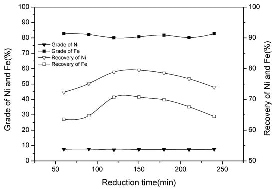 Under the conditions of reduction temperature 1200 °C, coal addition 10%, CaF2 addition 12%, Fe2O3 addition 10%, and magnetic field strength 170 kA/m, the effect of reduction time on the nickel–iron concentrate was examined, and the results are shown in Figure 4. As shown in Figure 4, the grades of Ni and Fe in nickel–iron concentrate changed insignificantly with increasing reduction time from 60 min to 240 min, but the recoveries of Ni and Fe in nickel–iron concentrate iron increased gradually from 60 min to 120 min and decreased gradually when the reduction time exceeds 150 min. The reason might be that the ferro-nickel granules generated would become more tightly bound to surrounding minerals with the increasing roasting time. Therefore, the reduction time varying between 120 min and 150 min is optimal.