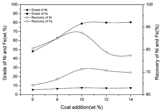 Coal has been applied in many metal reduction processes to improve the reduction rate. The effect of coal addition on the nickel–iron concentrate was investigated under the conditions of reduction temperature 1200 °C, reduction time 120 min, CaF2 addition 12%, Fe2O3 addition 10%, and magnetic field strength 170 kA/m, and the results are shown in Figure 5. As shown in Figure 5, the grades of Ni and Fe in nickel–iron concentrate increase gradually with increasing coal addition, and the grade of Fe increases more obviously when the coal addition is less than 10%. The recoveries of nickel and iron show parabolas and reach the maximum values at coal addition 10%. This phenomenon is primarily owing to the increasing coal addition providing a more comprehensive reduction atmosphere and increasing the effective surface area of the reaction when the coal addition is less than 10% [2]. However, the excessive coal addition at high temperatures would accelerate the reduction in ferrocarburizing, which would reduce the metallization rate of the reduction product. Therefore, the coal addition 10% is optimal.