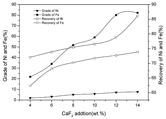- The addition of CaF2 for the solid-state metallized reduction could dramatically improve the beneficiation of nickel and iron. When the addition of CaF2 was 12 wt.% of laterite nickel ore, the grades of nickel and iron in the nickel–iron concentrate increased from 2.01% and 21.92% to 7.32% and 78.74%, respectively; meanwhile, the recoveries of nickel and iron increased to 81.84% and 69.78%, respectively.