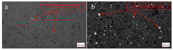 Microscopic photos: absence of CaF2 (a) and presence of CaF2 (b). The bright white particles represent ferro-nickel granules.