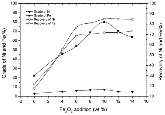 Effect of Fe2O3 addition on grades and recoveries of Ni and Fe.