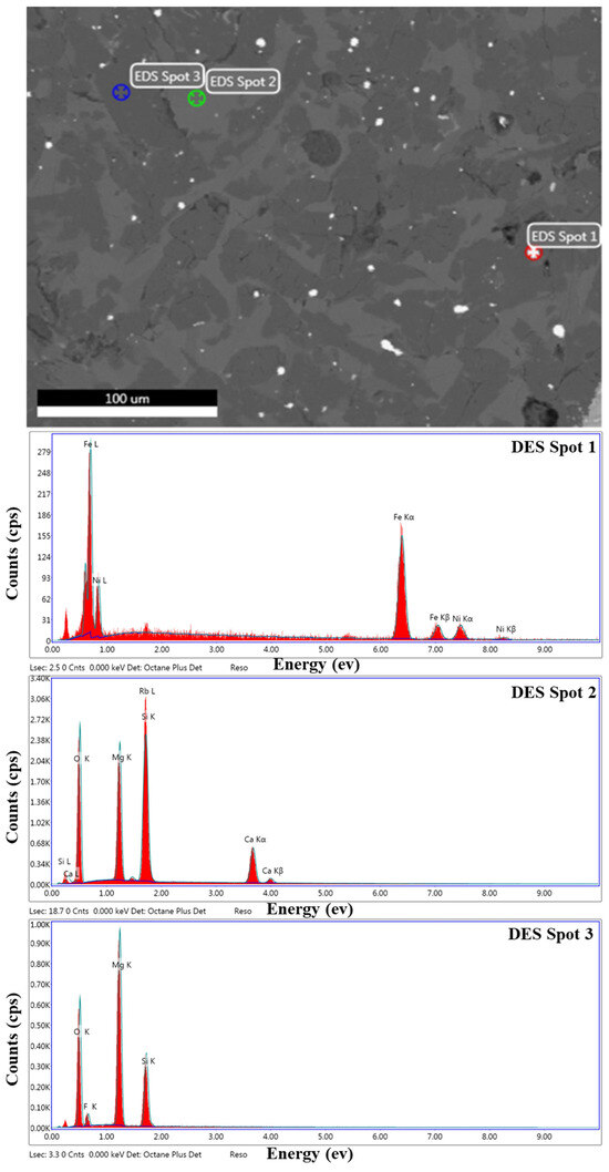 In this test, the elemental composition of the particular regions in reduction product was analyzed. The results of SEM image and EDS elemental analysis are shown in Figure 10, and the results of electron probe analysis are shown in Table 6, Table 7 and Table 8. The SEM images showed a mass of bright white particles generated and embedded in the charcoal gray matrix. The EDS analysis results show that reduction product are mainly composed of nickel–iron particles, tremolite-like minerals, and talc-like minerals. As shown in Table 6, the electron probe analysis show that the elemental composition of nickel–iron particles are Fe, Ni, Si, and Co, and the contents are 84.05%, 12.92%, 0.35%, and 0.32%, respectively. As shown in Table 7, the elemental composition of the tremolite-like mineral is SiO2 and MgO, and the contents are 60.00% and 37.28%, respectively. As shown in Table 8, the elemental composition of the talc-like mineral is SiO2 and MgO, and the contents are 54.52% and 20.84%, respectively.