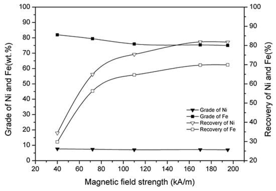 Effect of magnetic field strength on grades and recoveries of Ni and Fe.
