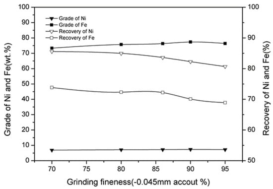 The magnetic field strength and grinding fineness are the main factors affecting the magnetic separation results. In this test, the effect of magnetic field strength and grinding fineness on the nickel–iron concentrate were also investigated, and the results are shown in Figure 11 and Figure 12. As shown in Figure 11, the grades of Ni and Fe in nickel–iron concentrate decrease slightly with the magnetic field strength increasing, and the grade of Fe decreases more significantly. The recoveries of Ni and Fe in nickel–iron concentrate increase constantly with the magnetic field strength increasing, and when the magnetic field strength is 170 kA/m, the recoveries of Ni and Fe reach the maximum values and then almost level off. Therefore, the magnetic field strength 170 kA/m is optimal. As shown in Figure 12, the grades of Ni and Fe in the nickel–iron concentrate increase slightly with the grinding fineness increasing. However, the recoveries of Ni and Fe in the nickel–iron concentrate decrease gradually with the grinding fineness increasing. Therefore, the grinding fineness −0.045 mm accounted for 80% is optimal.