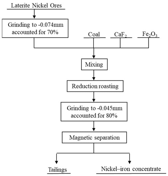 The utilization processes of laterite nickel ore could be generally divided into two types, i.e., hydrometallurgical process and pyrometallurgical process [5,6,7,8,9,10,11]. The typical hydrometallurgical processes include reduction-roasting–ammonia-leaching process and pressure-acid-leaching process [6,9], while the typical pyrometallurgical process is the rotary-kiln–electric-furnace-reduction-smelting process. The latter is widely used in laterite nickel ore smelters, and the pyrometallurgical process is primarily designed for high-grade laterite nickel ore [2]. However, the utilization of low-grade laterite nickel ore resources are receiving attention with the continuous consumption of laterite nickel ore resources, and the treatment processes of low-grade laterite nickel ore have been extensively studied [12,13,14,15,16,17,18], primarily including direct-reduction–magnetic-separation, reduction-sulfide-roasting–magnetic-separation and chlorination-separation−magnetic-separation. Huang et al. investigated a direct-reduction–magnetic-separation process to obtain ferronickel granules from laterite nickel ore with 1.59% Ni and 16.86% Fe [19]. The ferronickel granules with the grades of 9.4% Ni and 87.5% Fe were obtained at the conditions of the roasting temperature 1350 °C, the C/O molar ratio 1.4, the roasting time 60 min, the limestone amount 20%, and the recoveries of Ni and Fe were 93.8% and 84.8%, respectively. Rao et al. investigated the reduction/sulfidation behaviors of a laterite nickel ore in the presence of sodium sulfate; the results showed that sodium sulfate was of benefit to the selective reduction of nickel, and the addition of sodium sulfate leaded to an increased nickel metallization ratio under the same roasting temperature and time [20]. Li et al. investigated direct-reduction–magnetic-separation process to obtain ferronickel particles from laterite nickel ore with 1.91% Ni and 22.1% Fe, and a ferronickel alloy with 9.48% Ni and 79.3% Fe was prepared by reduction roasting at 1100 °C for 60 min in the presence of 20 wt.% sodium sulfate followed by wet magnetic separation; the corresponding recoveries of Ni and Fe were 83.01% and 56.36%, respectively [3]. It was found that the addition of sodium sulfate could liberate iron and nickel from Ni/Fe-substituted lizardite, as well as increase the size of ferronickel particles considerably, and the roasting temperature was reduced to 1100 °C. Ma et al. studied the solid-state metalized reduction process to obtain nickel–iron concentrate from laterite nickel ore with 0.8% Ni and 10.9% Fe; the addition of calcium fluoride (CaF2) dramatically improved the beneficiation of nickel and iron, and the grades of nickel and iron in the concentrate were increased from 2.5% and 62.6% to 6.9% and 71.4%, respectively [21]. The results suggested that the addition of CaF2 could effectively promote the migration and polymerization of newly generated alloy particles, which improved the beneficiation of nickel and iron by magnetic separation.