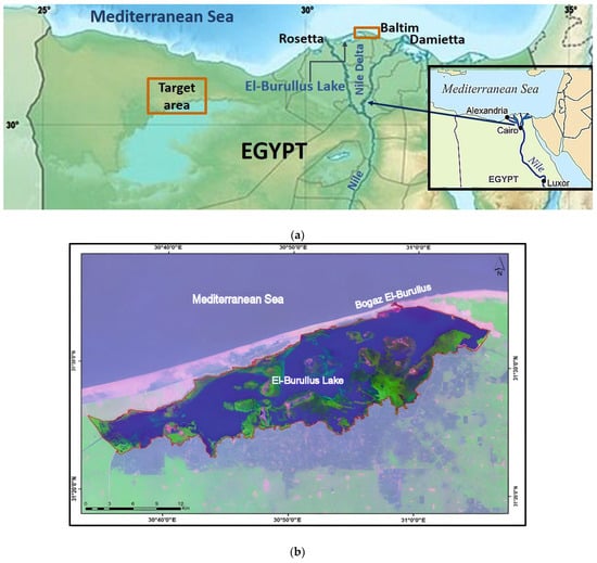 (a) Map of the Nile Delta and Mediterranean coast showing the location of the studied area. (b) El-Burullus Lake outline.