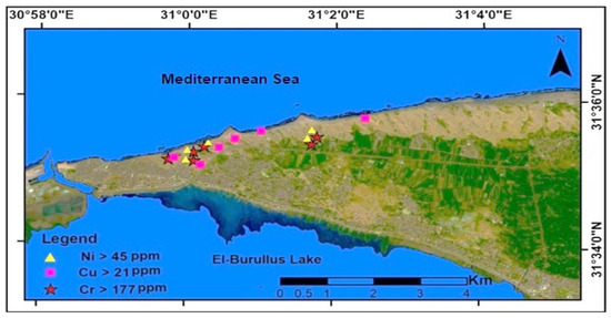 The Ni concentrations ranged from 23 to 68 mg/kg, with an average of 45.13 mg/kg, which is lower than the average concentration in shale [61]. The copper concentrations ranged from 20 to 26 mg/kg, averaging 21.20 mg/kg. The presence of urban and farmed regions was connected to the high geographical distribution of Cr, Ni, and Cu (Figure 3). The heavy metal concentrations of Ni, Cu, and Cr in the area were relatively low at the Eastern part of the studied coast and increased westward (Figure 3). The decrease in the Ni, Cu, and Cr heavy metal concentration in the Eastern parts corresponds to the areas which were characterized by a very high erosion rate (Figure 4). However, the increase in the beach sediments at the western zone was related to the areas which were characterized by high to very high accretion rates.
