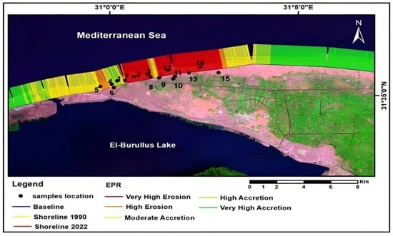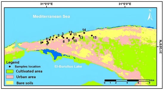 El-Burullus Lake, located in Kafr El-Sheikh Governorate (30°22′–31°35′ N; 30°33′–31°08′), Egypt, covers around 410 km2 and is the second largest coastal lake in northern Egypt. It is located on the eastern bank of the Rosetta branch of the River Nile (Figure 1b). Fifteen samples were collected along the Mediterranean seashore between Baltim and El-Burullus (Figure 2) with the aid of a spiral bar, rotated to a depth of one meter. The coordinates of the sampling points are presented in Table A1, Appendix A. The collected sediment samples were stored in plastic bags, kept in an ice box at (4 °C), and transferred to the laboratory, where they were kept in plastic bags for analysis after being dried in air at room temperature.