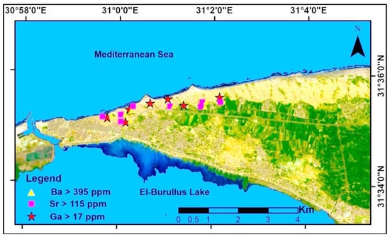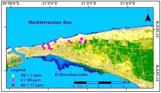 The Ba values in the sediment samples ranged from 88 to 804 mg/kg, with a mean of 395.53 mg/kg. Ba contents above the average for shale have been found in seven samples of both types of sediments studied [32]. The western zone, which is connected to urban activities and a high accretion area (Figure 5), and the central zone, which is connected to agricultural activities and a high erosion area, both had the largest concentrations of Ba. With an average of 115.40 and 16.53 mg/kg, the Sr and Ga values varied from 21 to 351 mg/kg and 1 to 37 mg/kg, respectively. In shale, both element concentrations were below average. In beach sediment samples, Sr and Ga had essentially comparable regional distributions. In the research area’s shoreline, they were numerous (Figure 6). The same Rb value of 2 mg/kg was found in every sediment sample studied, much less than the average shale content reported by [61] (Table 2). The average V concentration was 98 mg/kg, with values ranging from 20 to 205 mg/kg. In the western and central zones of the study region, seven samples had significantly higher amounts (Figure 7). The average concentration of niobium was 16.47 mg/kg, greater than that in shale, with niobium values ranging from 3–47 mg/kg. Only a small number of tests showed amounts higher than the legal limits (9 mg/kg). In samples with high V concentrations, Nb concentrations are also high (Table 2). Urban areas and agricultural activities situated in the high-accretion zones along the El-Burullus Lake coast are associated with the spatial distribution of samples with high concentrations of heavy metals (Figure 4 and Figure 8).