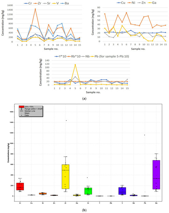 Distribution of trace elements in El-Burullus beach sediments. (a) Line chart showing the trends of element concentrations across the samples; (b) box plot showing the distribution of concentrations for each element.