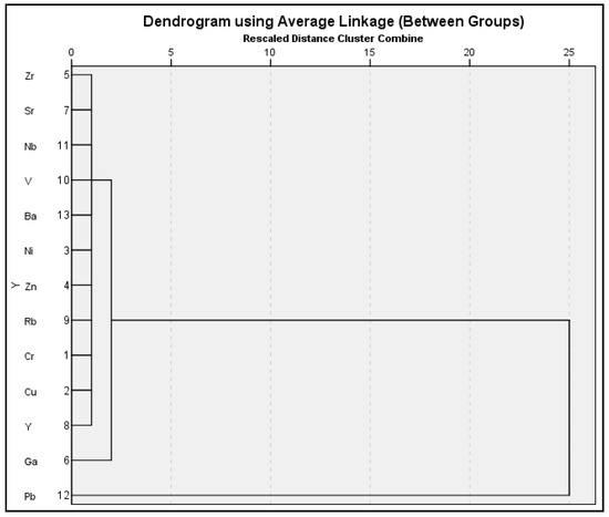The correlation between the examined chemical components was assessed using R-mode cluster analysis. The applied analysis relies on the Euclidean average linkage approach (within groups), which is adequate because its clusters are different and essential in revealing the kind of sediment in the study area. R-mode cluster analysis can be used to verify the outcomes, even though it is like factor analysis [84]. The R-mode cluster analysis dendrogram (Figure 10) revealed three unique groupings of element connection. The first set of elements consisted of Zr, Sr, Nb, V, Ba, Ni, Zn, Rb, Cr, Cu, and Y, the second of V and Ga, and the third of Rb and Pb.