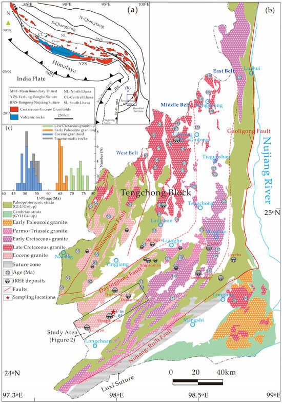 (a) Tectonic map of the eastern Tethys domain (modified after Wang et al. [47]); (b) Geological map of the Tengchong block with iREE deposits (modified after Deng et al. [48]); (c) U–Pb ages histogram of zircons from magmatic rocks in the Tengchong block (date from He et al. [15], Dong et al. [16], Xu et al. [18], Yang et al. [19], Li et al. [26], Zou et al. [30], Cong et al. [35], Cao et al. [39], Xie et al. [42], Chen et al. [44], Cong et al. [49], Li et al. [50], Chen et al. [51], Zhu et al. [52]).