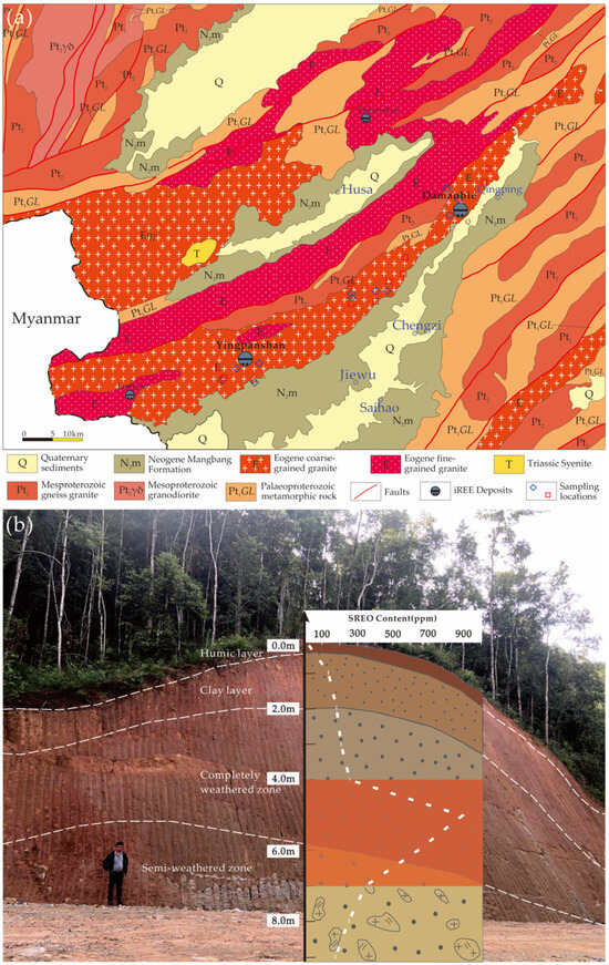 (a) Geological map of the Yingpanshan–Damanbie pluton with the Yingpanshan–Damanbie iREE deposit. (b) A profile of the regolith with iREE mineralization from the Yingpanshan–Damanbie iREE deposit.