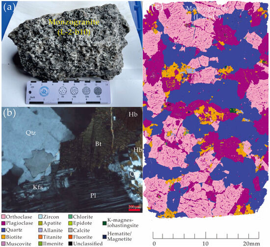 Characteristics of petrography and REE accessory minerals of monzogranite from the Yingpanshan–Damanbie iREE deposit in western Yunnan. (a) Photograph of a sample specimen; (b) photomicrograph; and (c) TIMA images of representative thin sections; abbreviations: Kfs = K–feldspar, Qtz = quartz, Pl = plagioclase, Bt = biotite, Ep = Epidote, Hb = hornblende.