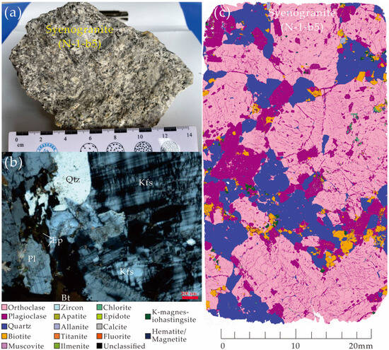 Characteristics of petrography and REE-bearing accessory minerals of syenogranite from the Yingpanshan–Damanbie iREE deposit in western Yunnan. (a) Photograph of a sample specimen; (b) photomicrograph; and (c) TIMA images of thin section; abbreviations: Kfs = K–feldspar, Qtz = quartz, Pl = plagioclase, Bt = biotite, Ep = Epidote.