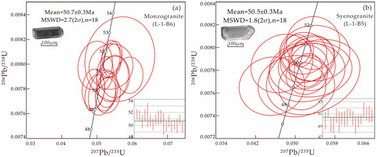 Complete results of the U-Pb isotopic data for these zircons are listed in Table 1. The 18 analysis points of zircon yield 206Pb/238U ages of 49.2 ± 1.4 to 51.6 ± 1.2 Ma, with a weighted mean age of 50.5 ± 0.3 Ma (MSWD = 1.8, 2σ) for the syenogranite (Figure 4a). The 16 analysis points of zircon yield 206Pb/238U ages ranging from 49.8 ± 0.7 to 51.7 ± 0.7 Ma, with a weighted mean age of 50.7 ± 0.3 Ma (MSWD = 2.7, 2σ) for the monzogranite (Figure 4b). We interpret these zircon U-Pb ages as the crystallization time of the Yingpanshan–Damanbie granitoids.