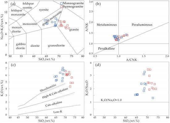 Major and trace element compositions of granitoids are presented in Table 2. In the SiO2–(Na2O + K2O) diagram (Figure 6a), samples are plotted in the field of granite and monzogranite, respectively. According to the abundance of K-feldspar (45–50 vol.%) and plagioclase (20–22 vol.%), the granite samples are classified as syenogranite.