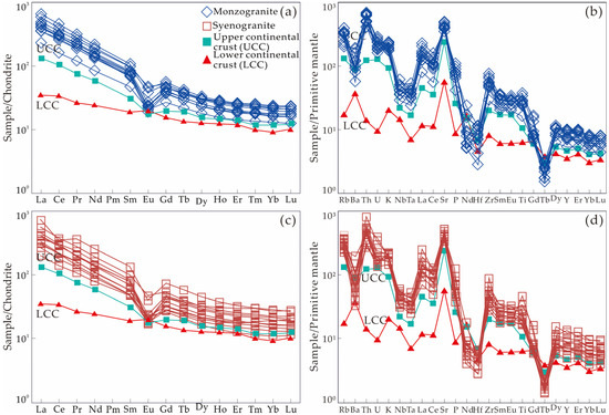 Plots of chondrite-normalized REE patterns (a,c) and primitive mantle (PM)-normalized spider diagrams (b,d) for monzogranite and syenogranite from the Yingpanshan–Damanbie iREE deposit. Values for normalization are from Sun and McDonough [68], respectively. UCC = upper continental crust; LCC = lower continental crust; UCC and LCC data from Jahn et al. [69].