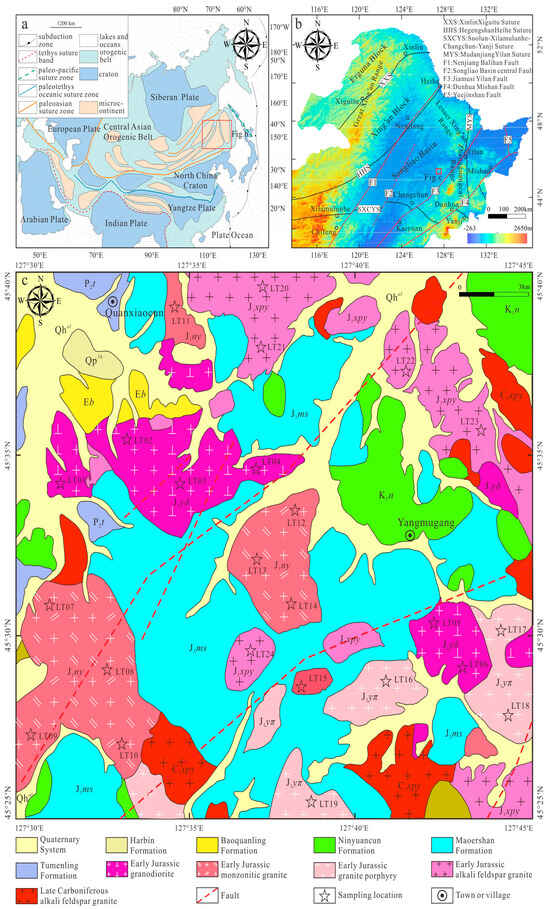 Schematic tectonic map showing the main subdivisions of Central and East Asia (a) (modified from [31]); the tectonic divisions of NE China, showing the major blocks, sutures, and faults (b) (modified from [12,32]); and a geological map of the study area (c).