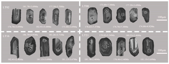 Sample LT16 was collected from the granodioritic porphyries located 5.6 km to the south of Yangmugang. The coordinates of the sampling point were 45°28′41″ N, 127°40′40″ E. The zircon grains exhibited transparent or semi-transparent euhedral to subhedral elongated prismatic crystals, with an elongated axis of 130–250 μm and length/width ratios of 1.3:1–2.5:1. In the CL images, the zircon grains exhibited distinct magmatic oscillatory zoning (Figure 3), and the Th/U values of 25 measuring points ranged from 0.46 to 1.91 (>0.1), indicating a typical magmatic origin for the zircons [36]. The age values for all the measurement points of sample LT16 were located on or near the Concordia curve (Figure 4c) and the weighted average age of 22 zircon grains was 177.8 ± 1.6 Ma (MSWD = 0.9), representing the crystallization age. Additionally, three zircon grains had ages of 111 ± 4 Ma, 152 ± 2 Ma, and 157 ± 4 Ma, which are the later magmatic hydrothermal event modification ages.