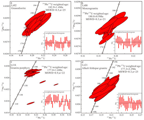 Sample LT21 was collected from the alkali feldspar granite located 11 km to the northwest of Yangmugang. The coordinates of the sampling point were 45°37′50″ N, 127°37′15″ E. The zircon grains were euhedral to subhedral elongated prismatic crystals, with an elongated axis of 150–200 μm and length/width ratios of 1.5:1–2.0:1. In the CL images, the zircon grains exhibited distinct magmatic oscillatory zoning (Figure 3), and the Th/U values of 25 measuring points ranged from 0.29 to 1.68 (>0.1), indicating a typical magmatic origin for the zircons [36]. The age values for all the measurement points of sample LT21 were located on or near the Concordia curve (Figure 4d). The weighted average age of the 25 zircon grains was 177.2 ± 2.2 Ma (MSWD = 0.3), representing the crystallization age.