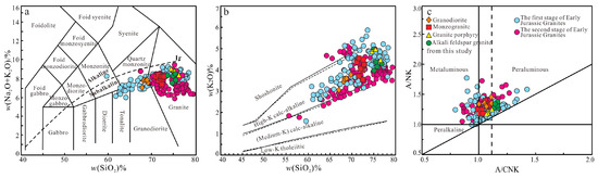TAS diagram (a) (modified from [37]), SiO2-K2O diagram (b) (modified from [38]), and A/CNK-A/NK diagram (c) (modified from [39]) of Late Jurassic granitoids from the Yangmugang area in the Lesser Xing’an–Zhangguangcai Range (data collection was modified from [22,23,24,26,40,41,42,43,44,45]).