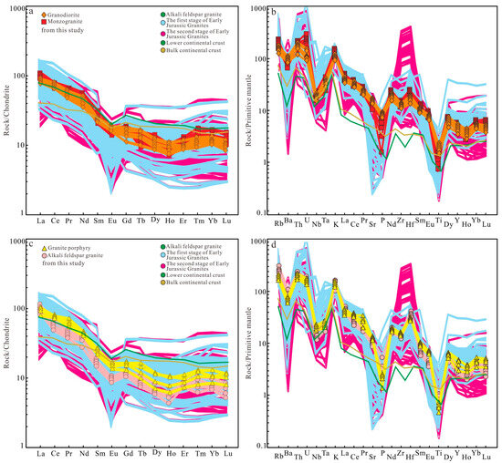 Chondrite-normalized REE distribution patterns (a,c) and primitive mantle-normalized multi-element spider diagrams (b,d) of Late Jurassic granitoids from the Yangmugang area in the Lesser Xing’an–Zhangguangcai Range (normalizing values modified from [46]).