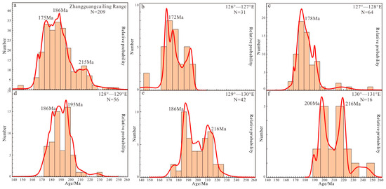 Figure 7. Frequency distribution diagram of zircon U-Pb ages of Early to Middle Mesozoic intrusive rocks in the Lesser Xing’an–Zhangguangcai Range (a–f).