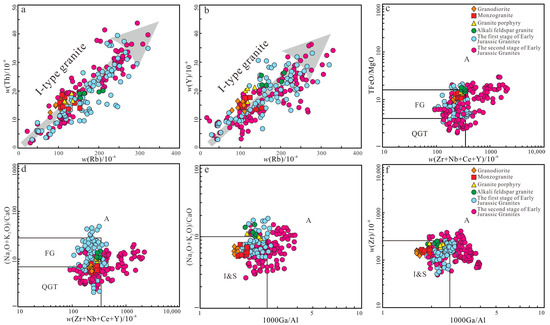 Rb-Th diagram (a), Rb-Y diagram (b) (a,b modified from [50,51,52]), (Zr + Nb + Ce + Y)-TFeO/MgO diagram (c), (Zr + Nb + Ce + Y)-(Na2O + K2O)/CaO diagram (d), 1000 Ga/Al-(Na2O + K2O)/CaO diagram (e) (c–e modified from [51]), and 1000 Ga/Al-(Zr) diagram (f) (modified from [16]) of Late Jurassic granitoids from the Yangmugang area in the Lesser Xing’an–Zhangguangcai Range. FG: fractionated granite; OGT: unfractionated M-, I-, and S-type granite.
