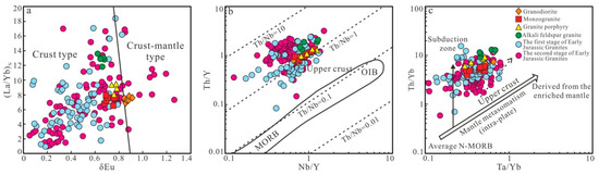 δEu-(La/Yb)N diagram (a) (modified from [67]), Nb/Y-Th/Y diagram (b) (modified from [68]), and Ta/Yb-Th/Yb diagram (c) (modified from [69]) of Late Jurassic granitoids from the Yangmugang area in the Lesser Xing’an–Zhangguangcai Range.