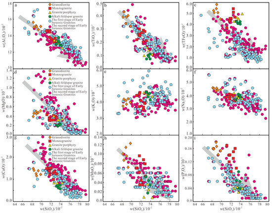 Harker diagrams of Late Jurassic granitoids from the Yangmugang area in the Lesser Xing’an–-Zhangguangcai Range. (a) SiO2-Al2O3 correlation diagram; (b) SiO2-TiO2 correlation diagram; (c) SiO2-TFeO correlation diagram; (d) SiO2-MgO correlation diagram; (e) SiO2-K2O correlation diagram; (f) SiO2-Na2O correlation diagram; (g) SiO2-CaO correlation diagram; (h) SiO2-MnO correlation diagram; (i) SiO2-P2O5 correlation diagram.