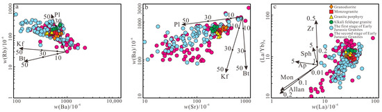 The Early Jurassic granitoid samples in the study area exhibited a right-skewed distribution in the rare earth element partition diagrams, which was characterized by enrichment in light rare earth elements and depletion in heavy rare earth elements (Figure 6a). The evolution of Eu shows a transition from weakly negative anomalies to stronger negative anomalies (Figure 6a). The identification diagrams Ba-Rb (Figure 11a) and Ba-Sr (Figure 11b) show that the loss of Sr, Ba, and Eu and the enrichment of Rb in the rock mass were mainly caused by the crystallization differentiation of potassium feldspar and anorthoclase (Figure 11a,b) [16,17]. The depletion of P and Ti was likely a result of the fractional crystallization of accessory minerals such as apatite and Fe-Ti minerals (Figure 11c). The depletion of Ba, Sr, and Nd further supports the evident mineral fractional crystallization during the magma evolution process.