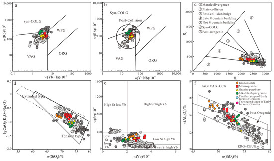 (Yb + Ta)-(Rb) diagram (a), (Y + Nb)-(Rb) diagram (b) (modified from [50]), R1–R2 diagram (c) (modified from [74]), SiO2-lgCaO/(K2O + Na2O) diagram (d), Yb -Sr diagram (e), and SiO2-Al2O3 diagram (f) of Late Jurassic granitoids from the Yangmugang area in the Lesser Xing’an–Zhangguangcai Range.