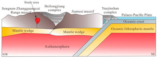 The Lesser Xing’an–Zhangguangcai Range is located in the northern part of the Xingmeng Orogenic Belt, situated between the North China Craton and the Siberian Craton [1]. From the Paleozoic to the Early Mesozoic periods, this region formed a tectonic stack due to the collision and amalgamation of multiple micro-continents, accretionary terranes, and tectonic belts. These micro-continents are divided from west to east into the Erguna block, the Xing’an block, the Songnen–Zhangguangcai Range block, the Jiamusi block, and the Khanka block [3,4,5,8]. The western part of the Songnen–Zhangguangcai Range block, where the study area is located, features younger sediments from the Late Mesozoic to the Cenozoic periods in the Songliao Basin [29]. The eastern part is divided into the Lesser Xing’an–Zhangguangcai Range tectonic belt by the north–south-trending Jiamusi–Yilan Fault [2]. This region exhibits sporadic outcrops of Paleozoic volcanic–sedimentary strata and metamorphic marine sedimentary strata, with the extensive development of Middle to Late Mesozoic volcanic–sedimentary formations and Phanerozoic granites [21,25,29]. To the east of the study area, the Jiamusi block is a micro-continent with an ancient crystalline basement, connected to the Songnen–Zhangguangcai Range block via the Heilongjiang Complex. The magmatic activity in this block has been concentrated in four periods [11]: the Cambrian, Permian, Triassic, and Cretaceous periods. The amalgamation history of the Songnen–Zhangguangcai Range block and the Jiamusi block—two crucial tectonic units at the eastern end of the Xingmeng Orogenic Belt—is closely related to the evolution of the Mudanjiang Ocean, with the Mudanjiang Suture Zone serving as the boundary between the Songnen–Zhangguangcai Range block and the Jiamusi block [25]. The Heilongjiang Complex, a key piece of evidence for the evolution of the Mudanjiang Ocean, forms a north–south-trending belt distributed in the Luobei–Jiayin, Yilan–Huanan, and Mudanjiang areas of Heilongjiang Province [11,15,30]. It primarily consists of blueschists, serpentinites, amphibolites, greenschists, phengite schists, and marbles. Its petrological and geochemical characteristics indicate that the protolith of the blueschists has an oceanic island basalt nature and was formed during the Permian–Triassic period, with metamorphism occurring in the Late Triassic–Jurassic period [11,27]. Therefore, the Heilongjiang Complex is considered a high-pressure metamorphic belt formed by the subduction, collision, and amalgamation between the Songnen–Zhangguangcai Range block and the Jiamusi block [11,28].