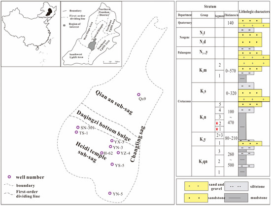 The Songliao Basin, situated in the northeastern region of China, spans across Heilongjiang, Jilin, and Liaoning provinces. It represents a rhombus-shaped basin covering an area of approximately 26,000 square kilometers, characterized as a significant Mesozoic–Cenozoic terrestrial sedimentary basin [43]. The Changling Depression, predominantly located in the southern part of the Songliao Basin (Figure 1), encompasses an area exceeding 20,000 square kilometers, exhibiting distinct structural attributes such as a fault–basin double-layer structure. The fault depression layers are primarily centered around deep-water faulted lacustrine sedimentation, characterized by rapid subsidence and the subsequent rapid infilling of over-compensation sedimentation. Tectonic fault activities significantly control sedimentation within this region. Additionally, influenced by the paleostructural background and sediment water dynamics, the southern segment of the Songliao Basin experiences overall regression from the Nen-1 Formation to the Ming-2 Formation. The facies transition trend from bottom to top comprises semi-deep lake to deep lake subfacies, shallow lake subfacies, delta front subfacies (braided river delta front subfacies), and delta plain subfacies (braided river delta plain subfacies). The depression layer exhibits a unified sedimentation area with extensive sedimentation coverage and stable sedimentation characteristics. The strata within the depression encompass the Lower Cretaceous Denglouku Formation, Quantou Formation (K1q), Upper Cretaceous Qingshankou Formation (K2qn), Yaojia Formation (K2y), and Nenjiang Formation (K2n) [44,45,46]. The Changling Depression comprises three tectonic units: the Heidimiao Subsag, Daqingzi Low Anticline, and Qian’an Subsag (Figure 1).