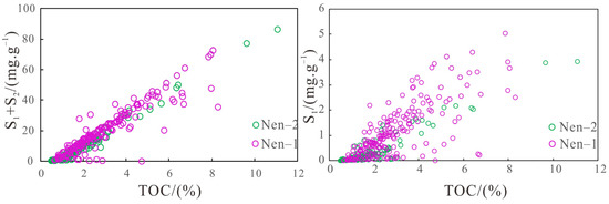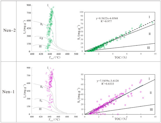 The hydrogen index and oxygen index chart can effectively classify the types of organic matter. Type I organic matter produces a large amount of pyrolysis hydrocarbon S2 and poor carbon dioxide S3 during pyrolysis, while Type III organic matter only produces a small amount of heat transfer hydrocarbon and rich carbon dioxide S3 [57]. According to the analysis of existing shale samples (Figure 3), the distribution range of pyrolysis hydrocarbon S2 in the shale of the Nen-1 is between 0.05 and 68.8 mg/g, with an average of 18.54 mg/g. The actual hydrogen index obtained from the linear slope (R2 = 0.83) of S2 and TOC was found to be about 755 mg/g, indicating that the Nen-1 is mainly Type I~II1 kerogen, which is consistent with the measured hydrogen index. The distribution range of pyrolysis hydrocarbon S2 in the Nen-2 was 0.17 mg/g~82.42 mg/g, with an average of 13.79 mg/g. From the linear slope of S2 and TOC (R2 = 0.98), the actual hydrogen index was about 856 mg/g, revealing that the organic matter type of most samples is Type I~II2 kerogen [59].