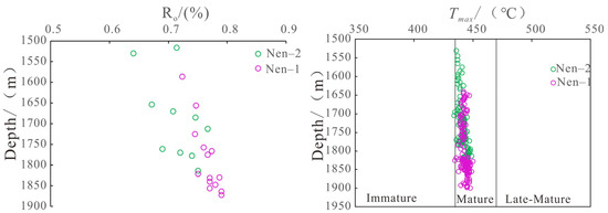 Vitrinite reflectance (Ro) is a crucial parameter for determining the thermal evolution stage of organic matter. The peak period of hydrocarbon generation is an important period for shale oil and gas accumulation. Many studies have shown that the maturity of organic matter Ro is generally 0.5%~1.2% [60,61]. The shale samples of the Nenjiang Formation were distributed between 0.50% and 0.80%. Among them, the vitrinite reflectance Ro of the shale in the Nen-1 was distributed between 0.59% and 0.80%, which is in the stage of low-mature to mature thermal evolution. The vitrinite reflectance Ro of shale in the Nen-2 was between 0.58% and 0.77%, which is in the stage of low maturity to mature thermal evolution. The thermal evolution degree of Nen-1 shale was slightly higher than that of Nen-2 shale due to burial depth influence (Figure 4).