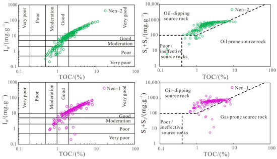 The hydrocarbon generation potential (S1 + S2) of the Nen-1 was between 0.06 mg/g and 72.47 mg/g, with an average of 19.67 mg/g. Most of the samples were distributed in the range of 10 mg/g~20 mg/g, followed by more than 20 mg/g. The number of samples greater than 2.0 mg/g and 6.0 mg/g accounted for 98% and 82% of the total number of samples, respectively. The hydrocarbon generation potential of the Nen-2 was between 0.17 mg/g and 82.42 mg/g, with an average of 13.79 mg/g, and the hydrocarbon generation potential was slightly lower than that of the Nen-1.