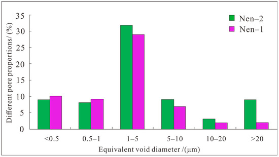 The pore types developed in the study area mainly developed interlayer micropores, followed by intra-debris micropores, and the development of organic matter micropores and intergranular micropores was relatively small. From the frequency of the micro-pore diameter of the Nenjiang Formation, it is concluded that most of the micro-pore diameters developed in the Nen-1 and Nen-2 were less than 20 μm, concentrated with 1 μm~5 μm, and the pore widths of the Nen-2 were 1 μm~5 μm, 5 μm~10 μm, 10 μm~20 μm, >20 μm. The four levels were relatively larger than the Nen-1 (Figure 7). The average diameter of the Nen-2 was larger than that of the Nen-1, indicating that the micro-pores of the Nen-2 were more developed than the Nen-1.