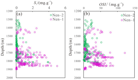 The variation trend of S1 (a) and OSI (b) with depth in the Nen-1 and Nen-2 in the Changling Sag.