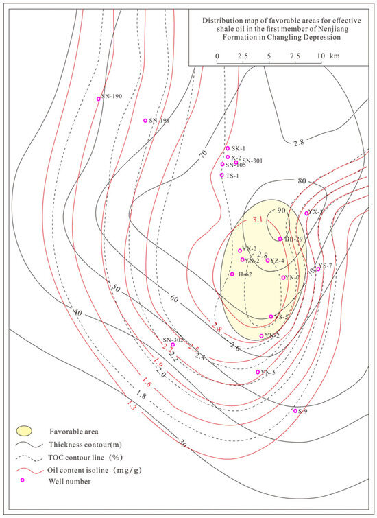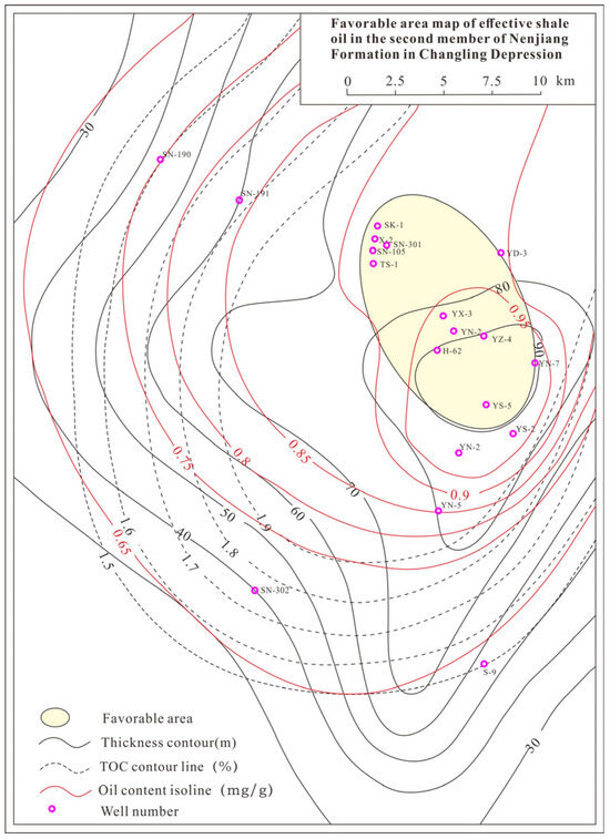 In summary, the favorable zone for the generation of low-maturity shale oil in the Changling Depression meets the criteria of TOC greater than 2.0%, effective shale thickness greater than 30 m, and oil saturation (S1) greater than 0.5 mg/g. These zones are mainly concentrated in the Haidimiao Sub-Depression and its adjacent areas. Specifically, the favorable shale oil enrichment area in the Nen-2 Sub-Formation is located in the northwest part of the Haidimiao Sub-Depression (Figure 11), while in the Nen-1 Sub-Formation, it is situated in the northeast part of the Haidimiao Sub-Depression (Figure 12).