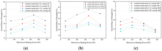3.2.2. The Effect of Microwave Heating Power on the UCS Growth Rate of CTB with Different Cement–Sand Ratios