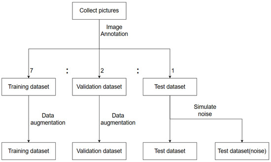 After adding simulated noise, the total dataset reached 840 images (620 original images + 240 noise-added images, with 60 images each for simulated dust, low brightness, lens smudges, and dynamic blur). However, this is still far from sufficient for training the Faster R-CNN model, including the improved version, due to the network’s large number of parameters. Given the extensive parameters, training requires a significant amount of labeled input data. Annotating ore images is time-consuming and labor-intensive, resulting in relatively limited annotated data. To effectively utilize the limited annotated ore images for model training, this study employs data augmentation techniques, including fixed-angle rotation, translation, and scaling. Through this approach, the total number of images in the original dataset was expanded to 5280. This method effectively increases the dataset’s diversity, enhancing the model’s generalization capability. The overall data processing workflow is illustrated as shown in Figure 11.
