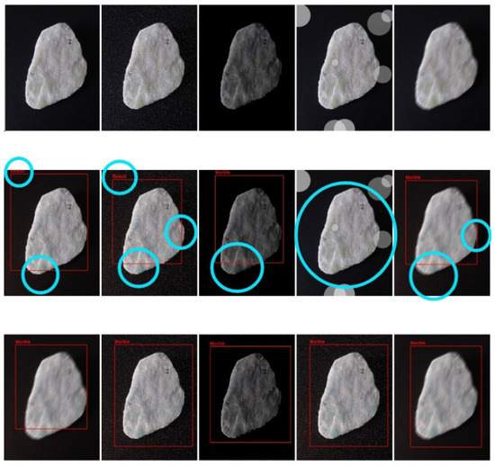 In the experiment on single-class rock (marble) detection (as shown in Figure 15), the original model demonstrated significant shortcomings when dealing with noise interference. On the noise-free dataset, the original model not only made classification errors but also failed to fully cover the target object with its generated bounding boxes, leaving the lower edge of the object outside the box. When dust noise was introduced, the performance of the original model further deteriorated, with continued classification errors, and the bounding boxes became smaller, shifted, or failed to completely enclose the target object, making it difficult to capture the full extent of the rock. These issues were particularly pronounced under low-light conditions and motion blur. Although the classification was correct in low-light conditions, the model detected only half of the target object, and under motion blur, parts of the bounding box still failed to capture the target. The model’s over-reliance on edge features may cause a lack of robustness in complex environments, especially under lens smudge interference, where the detection accuracy of the original model significantly dropped, leading to noticeable instances of missed detections. This indicates substantial limitations of the original model in handling such complex disturbances. In contrast, the improved Faster R-CNN model demonstrated significant advantages under the same conditions. Whether in low-light environments or under dust and lens smudge interference, the improved model was able to robustly identify the boundaries of the marble. The generated detection boxes not only closely aligned with the actual contours of the rock but also maintained high accuracy in complex backgrounds.
