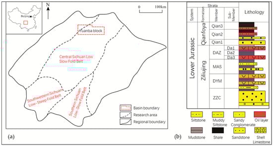 The core samples were selected from the Daanzhai Member, which contains the terrestrial shale of the Ziliujing Formation in the Yuanba region, Sichuan Basin, at depths of 3500–4150 m (Table 1). One well, YB21, was discovered to produce 209,000 cubic meters per day during a drill test. The Yuanba region is geologically located between the central and western portions of the Sichuan Fold Belt [40,41,42,43]. The mining rights in the study area, with an exploration area of 3251.48 km2, belong to Sinopec. The target stratum is the gas-rich Daanzhai section, and the sedimentary environments can be divided into lakefront facies, shallow lake facies, and deep lake facies. (Figure 1a,b)