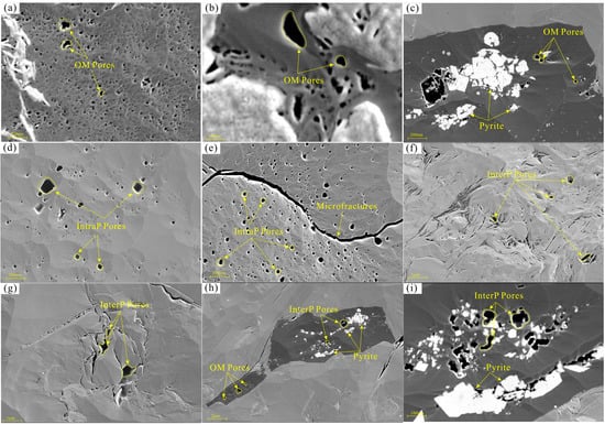 The mineral pores include pores between mineral particles, pores inside the mineral particles, and granules. The internal pores are mainly inside mineral particles and solution pores, such as pores inside clay and pyrite (Figure 2d,e). Compared with the intergranular pores, the intragranular pores are smaller, and the pore diameter is typically less than 300 nm. Most of the pores exist in isolation, but their distribution is relatively dense, and they are mainly irregular (Figure 2d) and circular (Figure 2e) in shape. Intergranular pores formed mainly in the process of diagenetic compaction due to the resistance of rigid particles (Figure 2f,g). Some pores are also present within pyrite crystals, and they are usually filled with organic matter and have developed into intergranular pores (Figure 2h,i).